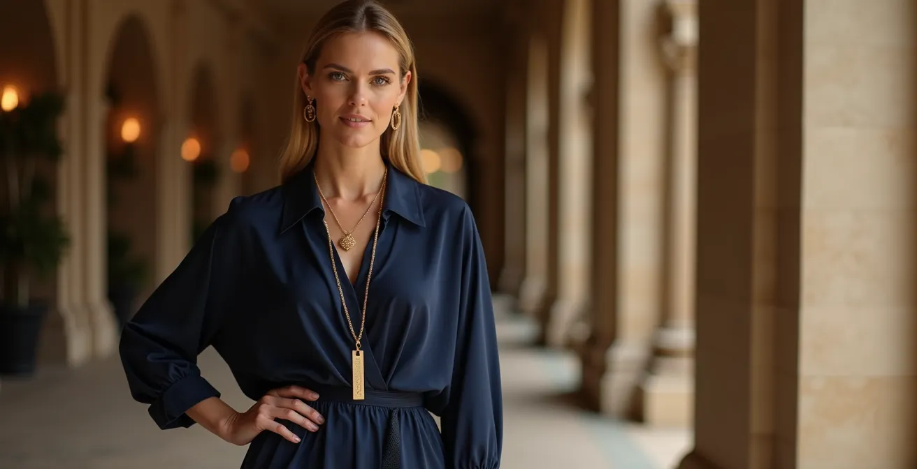 El escote que se forma naturalmente con un collar largo, a menudo en forma de ‘V’ o ‘Y’, es universalmente favorecedor. Ayuda a estilizar el cuello y a abrir el área del pecho, aportando luz al rostro. Este punto de anclaje visual superior equilibra la fluidez de la túnica. Para maximizar el efecto, elija collares que terminen justo por encima del ombligo, pero sin llegar a la parte más prominente del abdomen. Un collar que queda demasiado corto puede cortar la figura, mientras que uno excesivamente largo puede perder su poder estructurador.